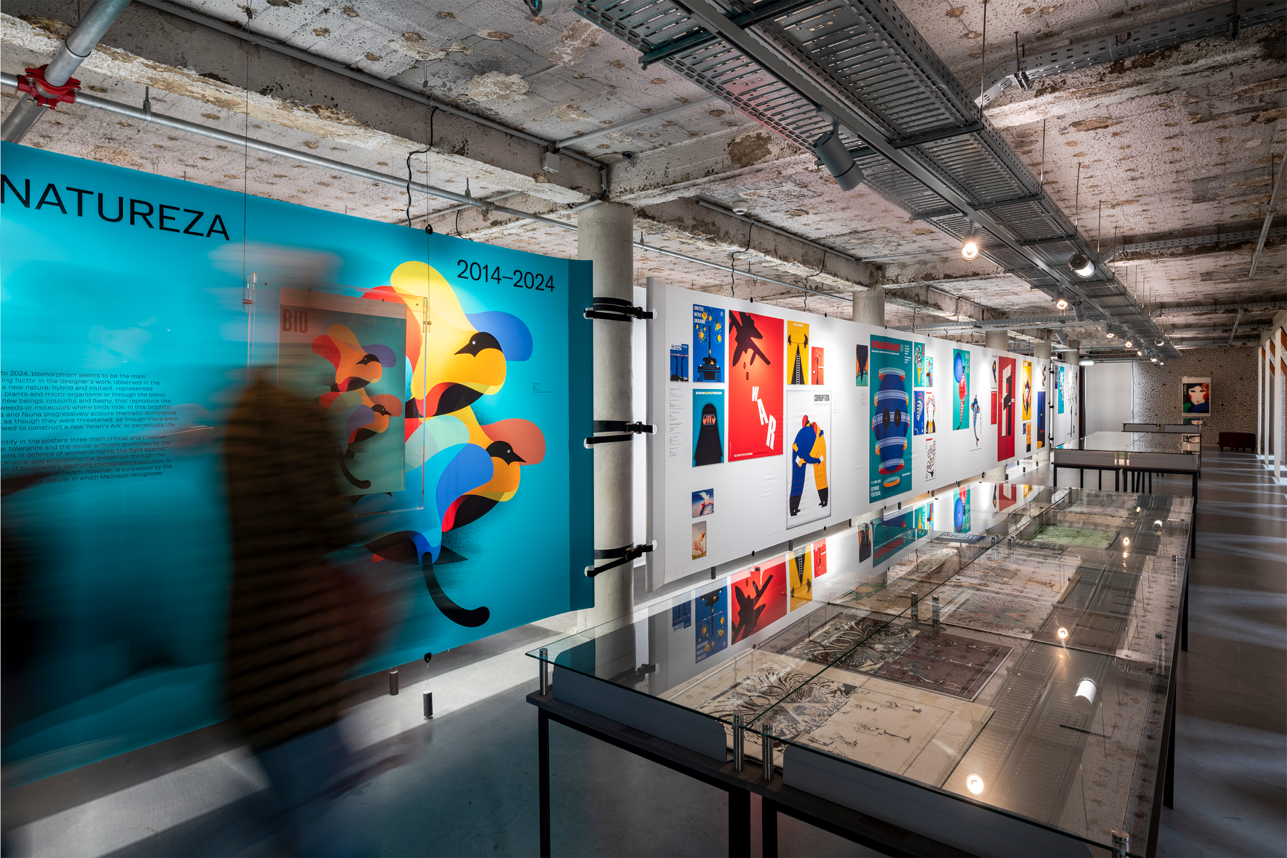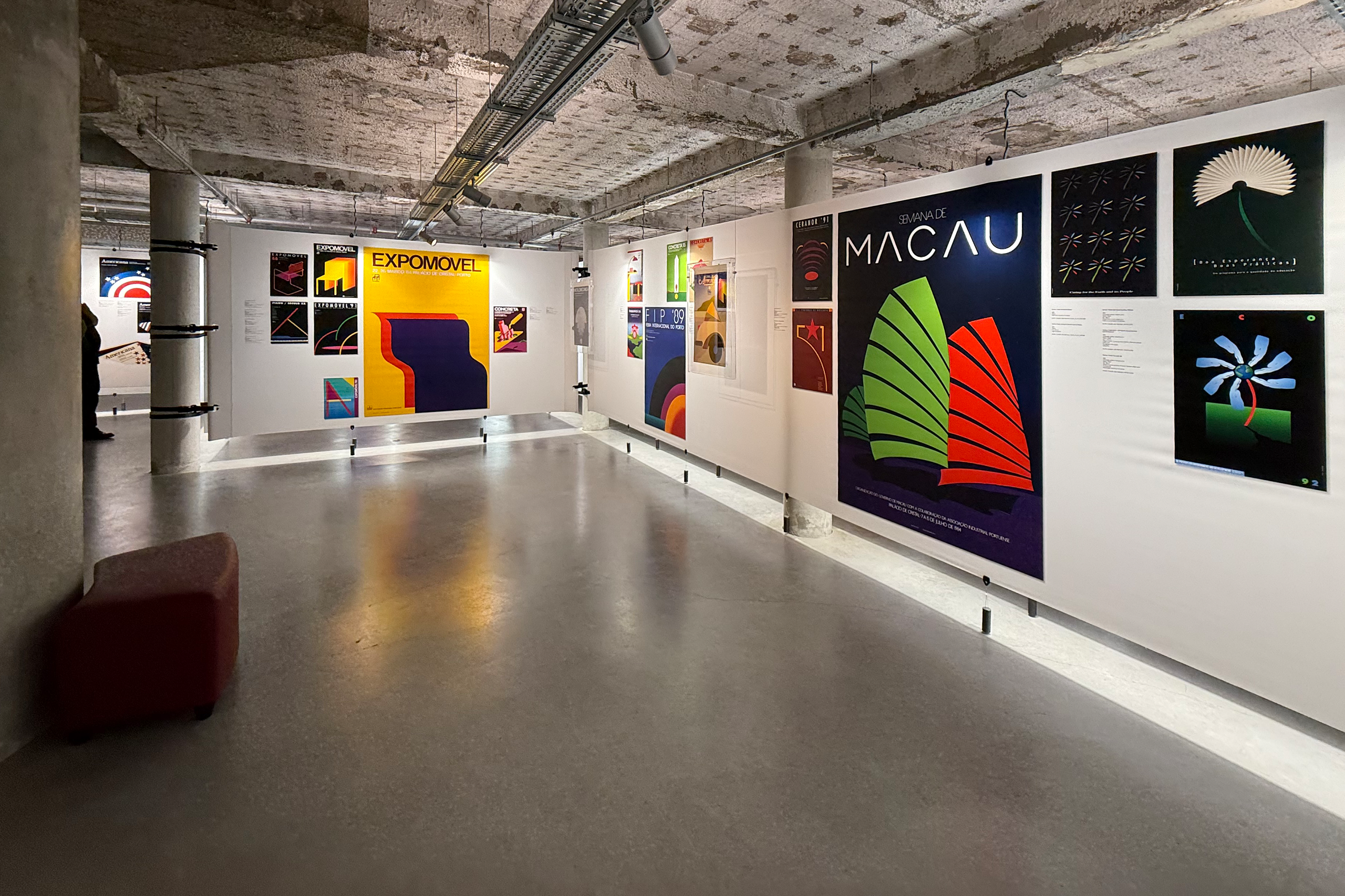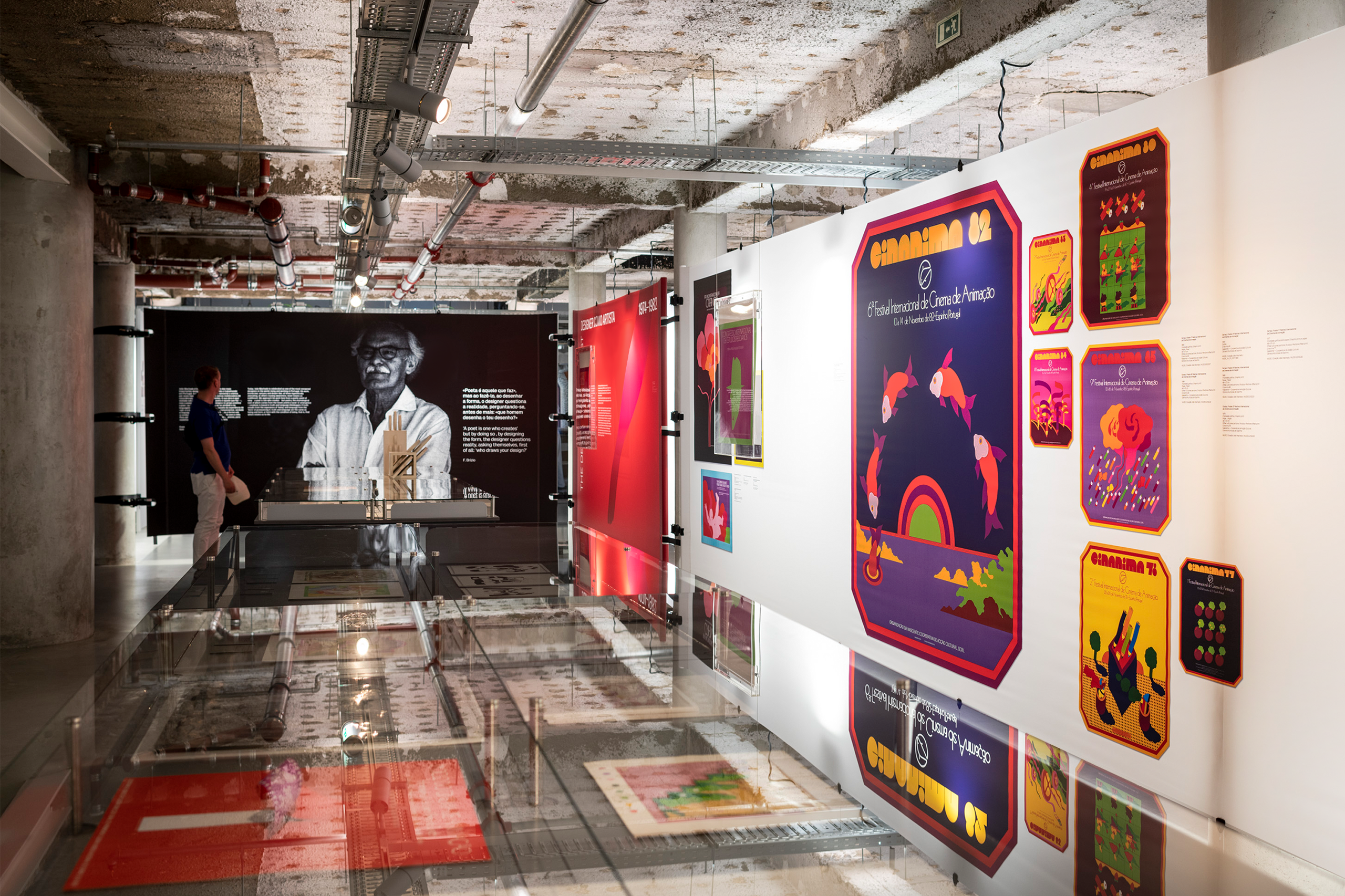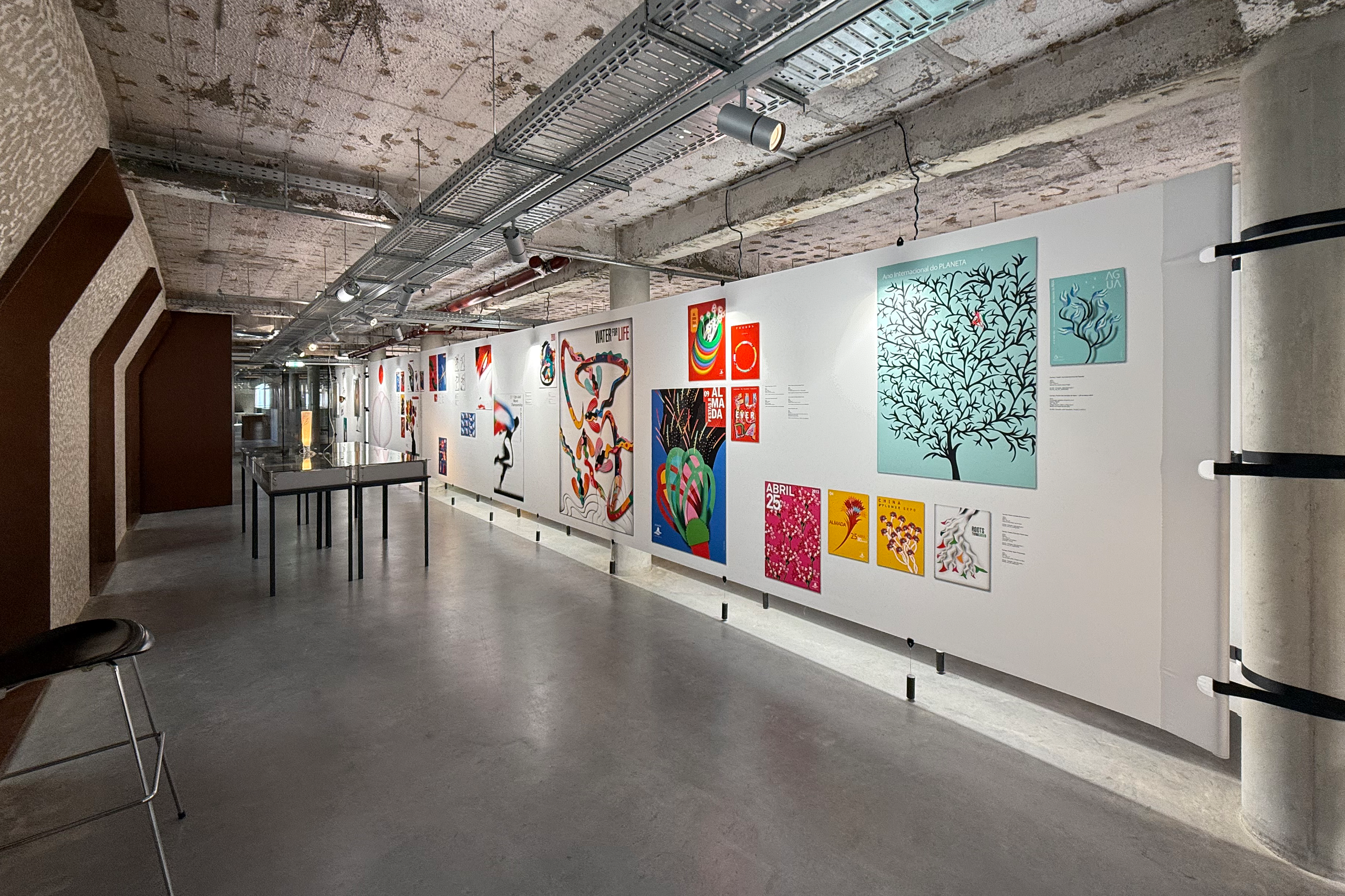 Within the double-height space, a large wall that dominates the entire area continuously projects a selection of posters, reinforcing the relationship between this exhibition and the MUDE collection.