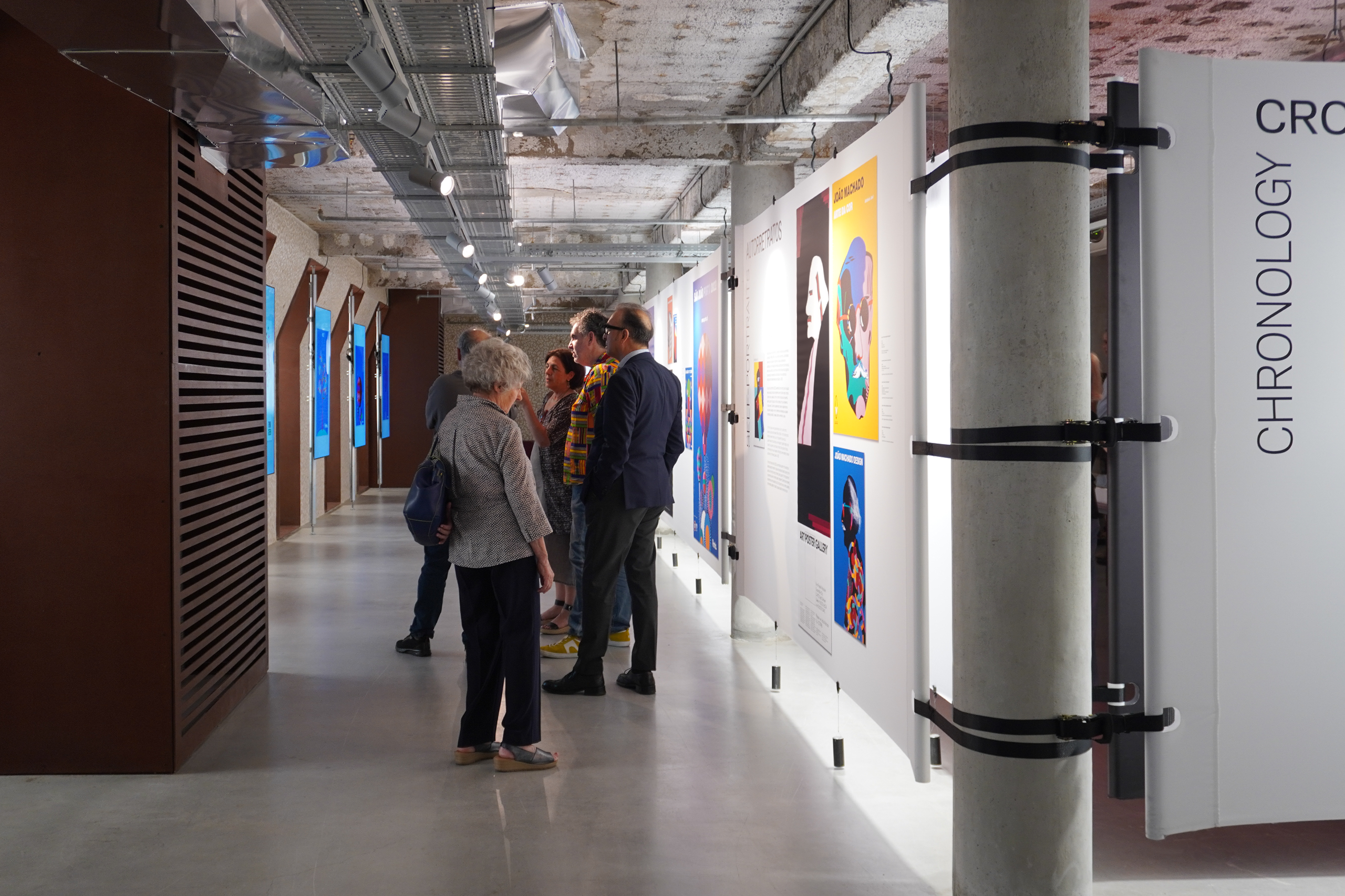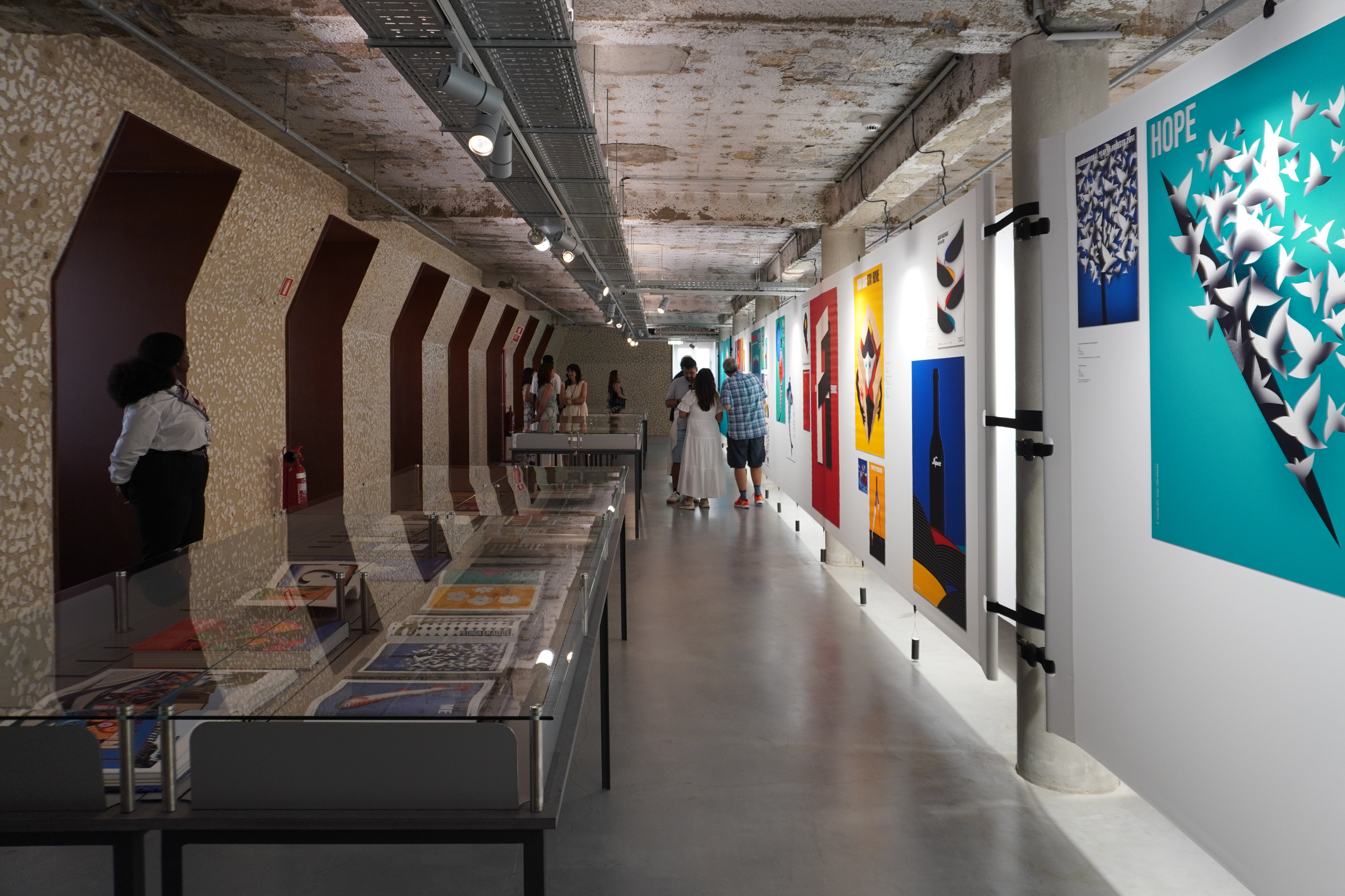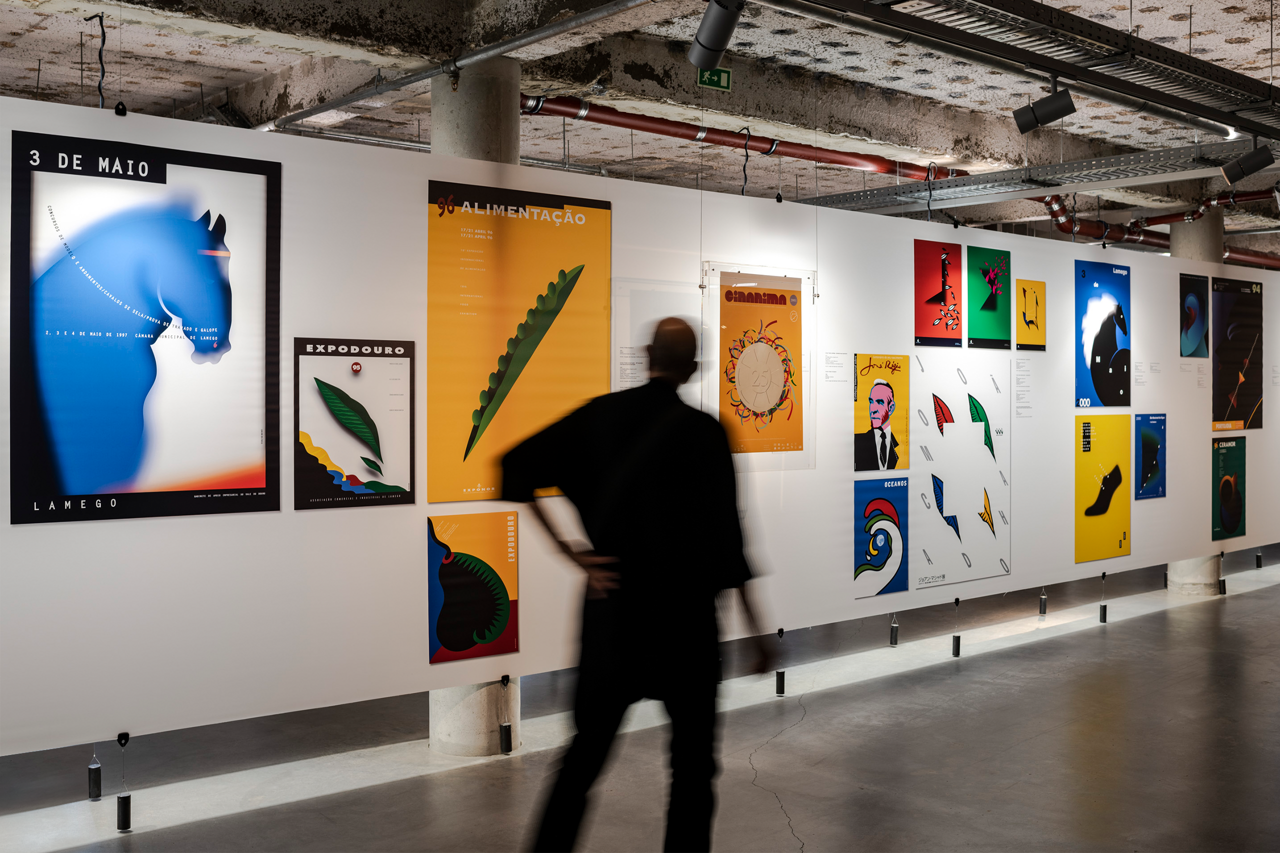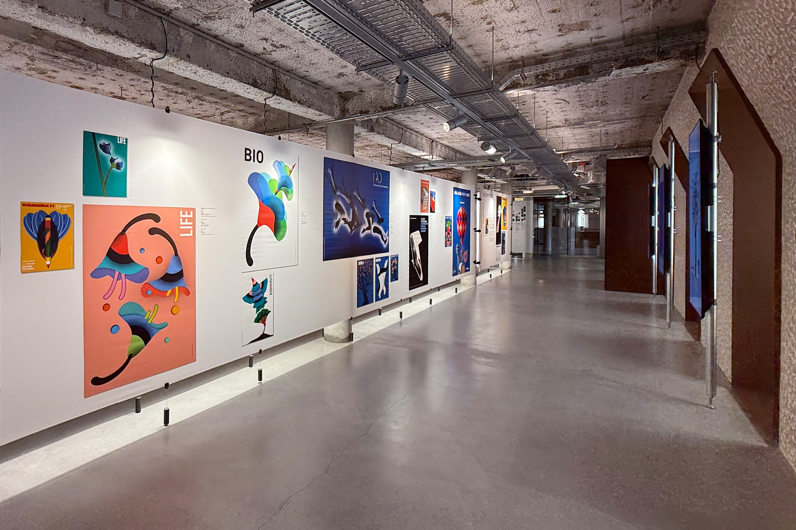 Within the double-height space, a large wall that dominates the entire area continuously projects a selection of posters, reinforcing the relationship between this exhibition and the MUDE collection.