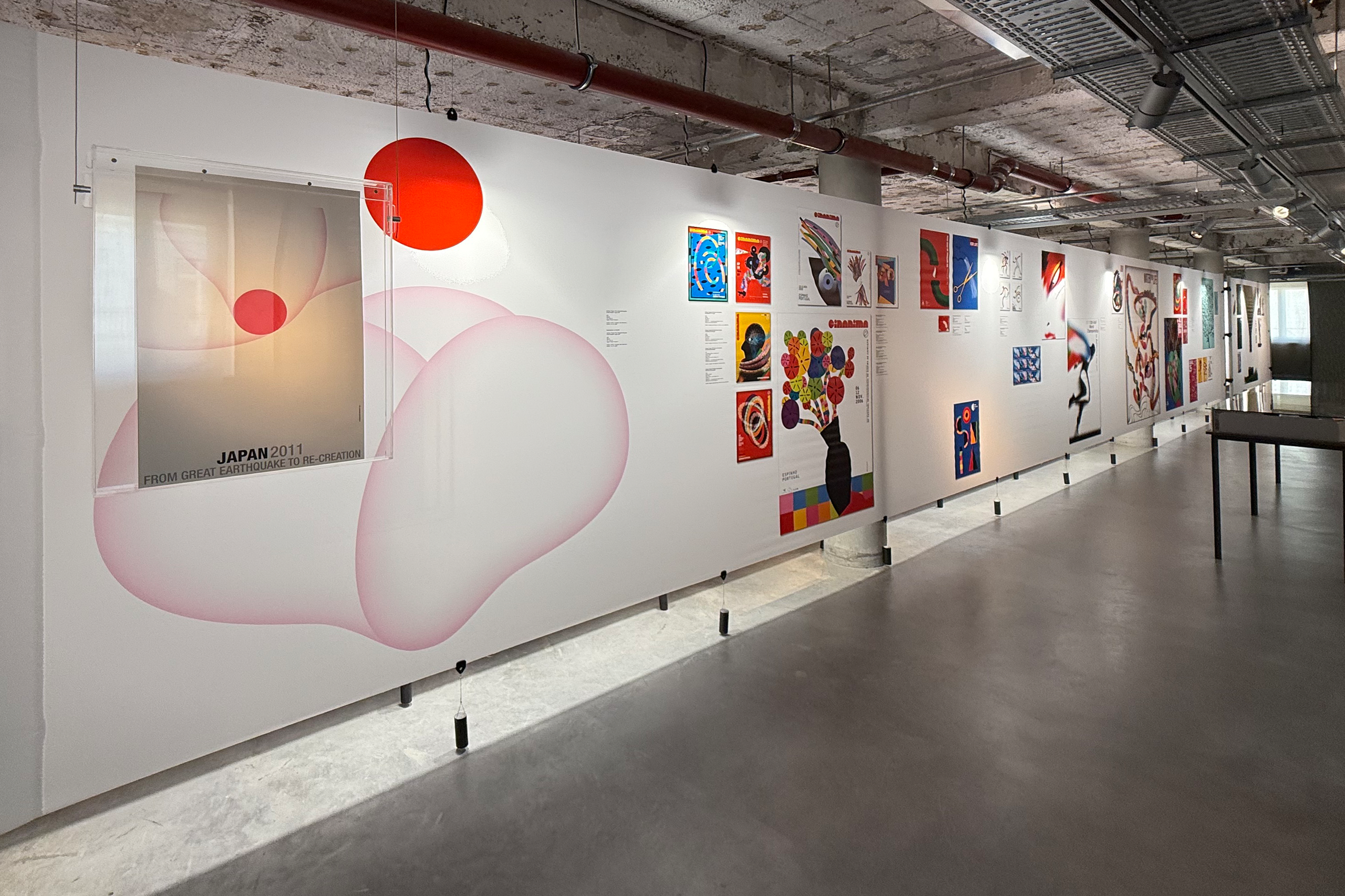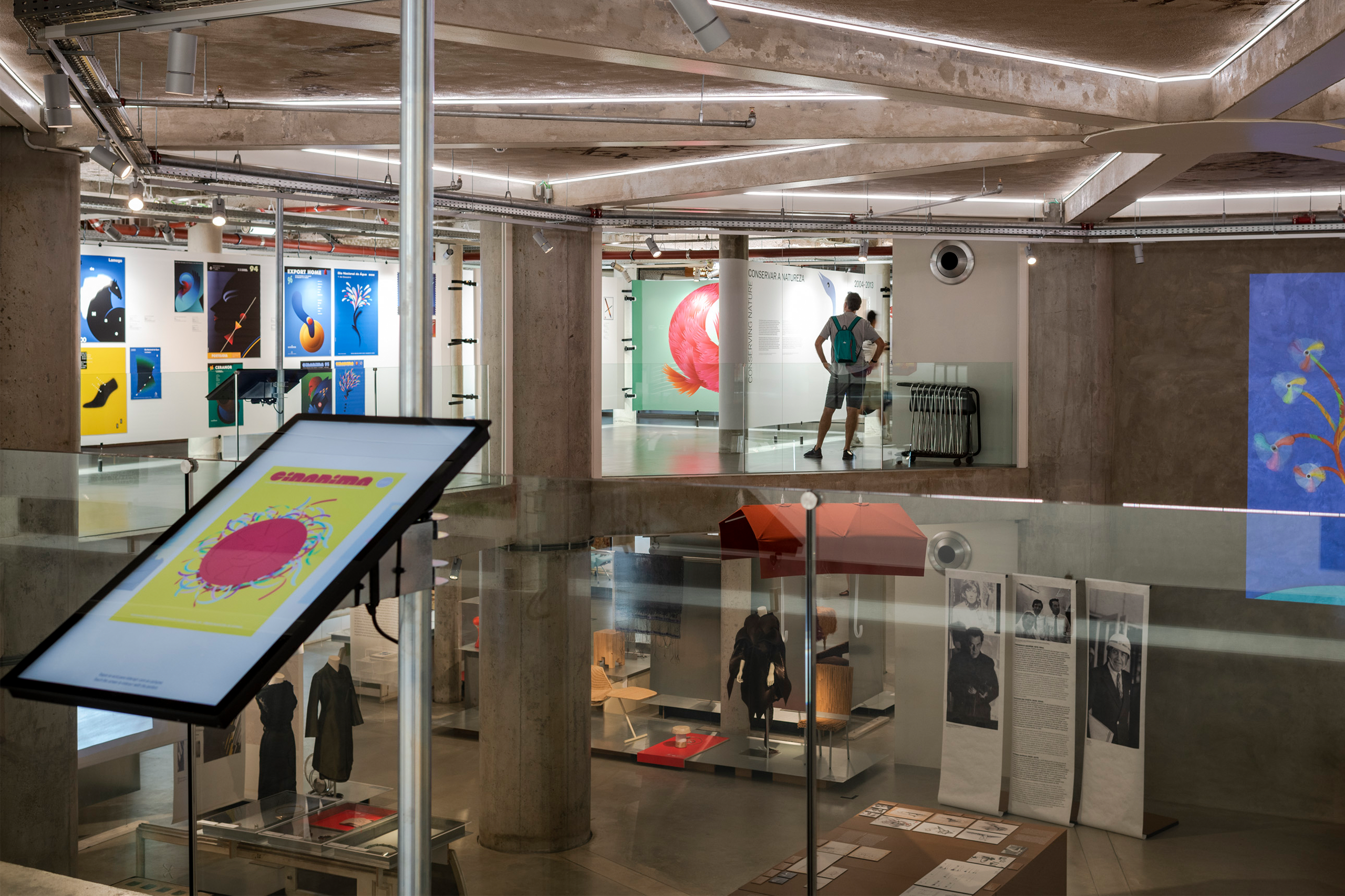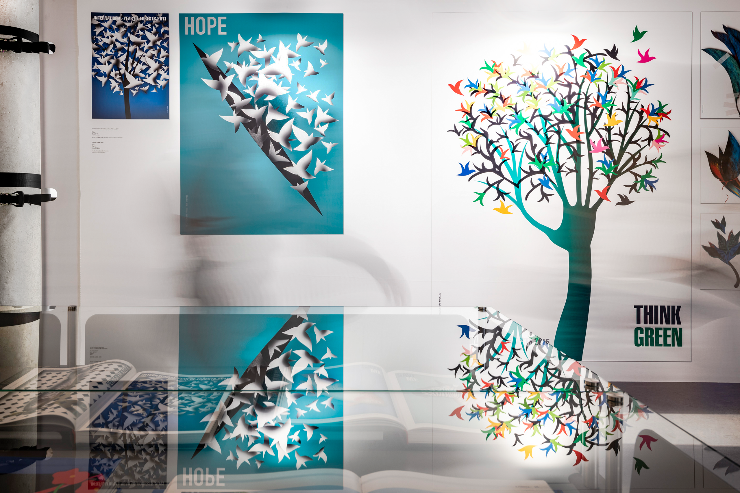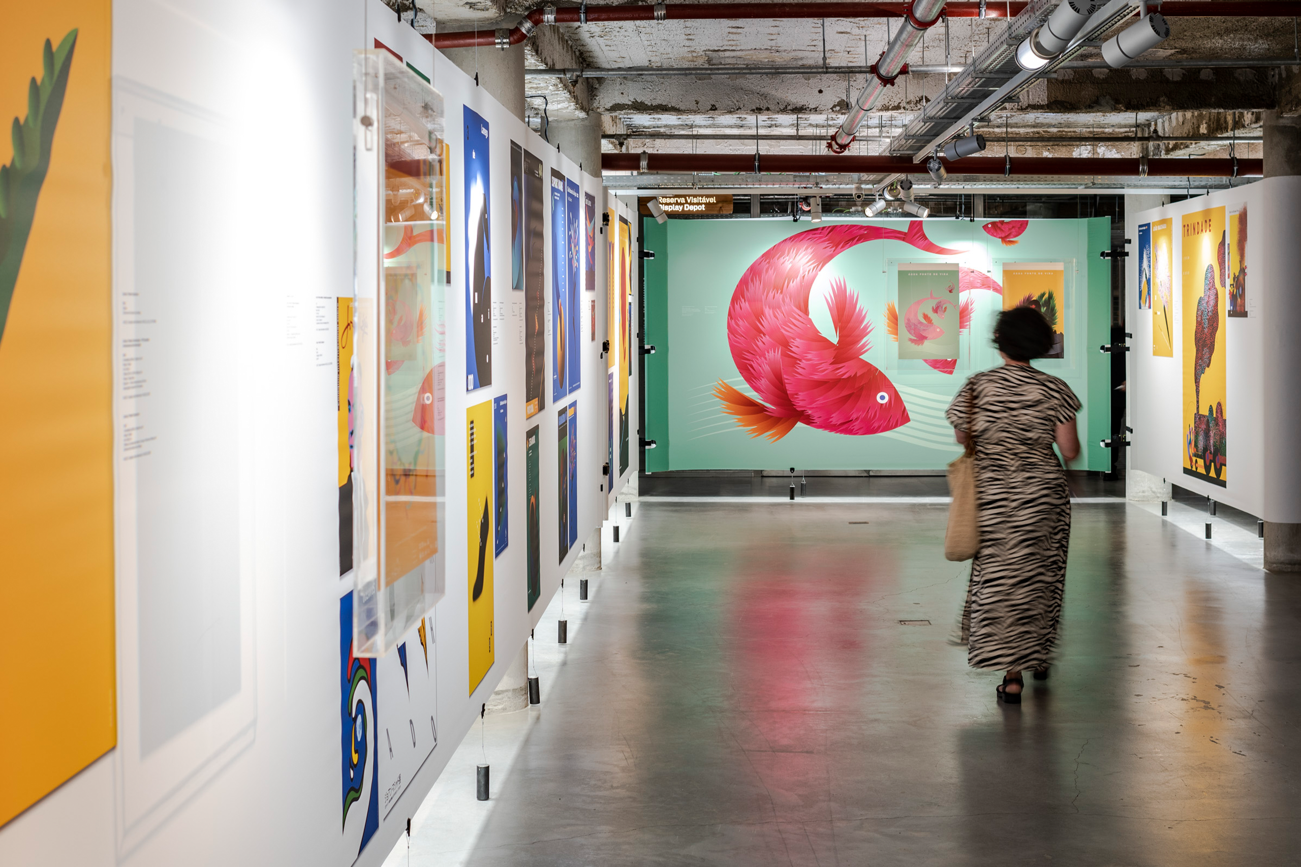 Within the double-height space, a large wall that dominates the entire area continuously projects a selection of posters, reinforcing the relationship between this exhibition and the MUDE collection.
