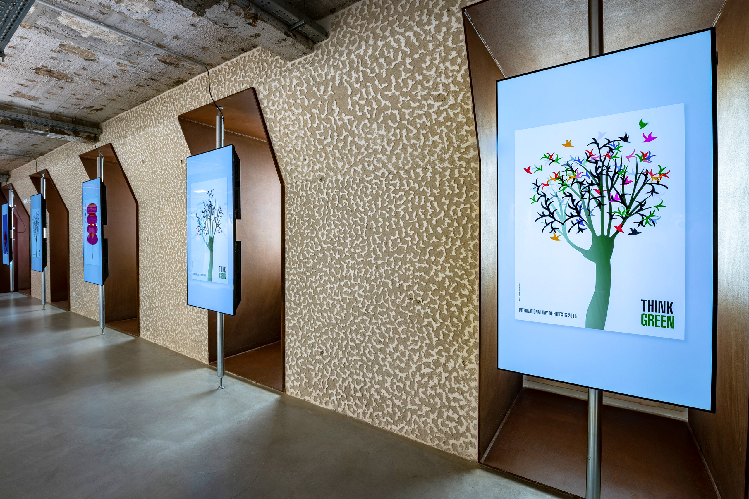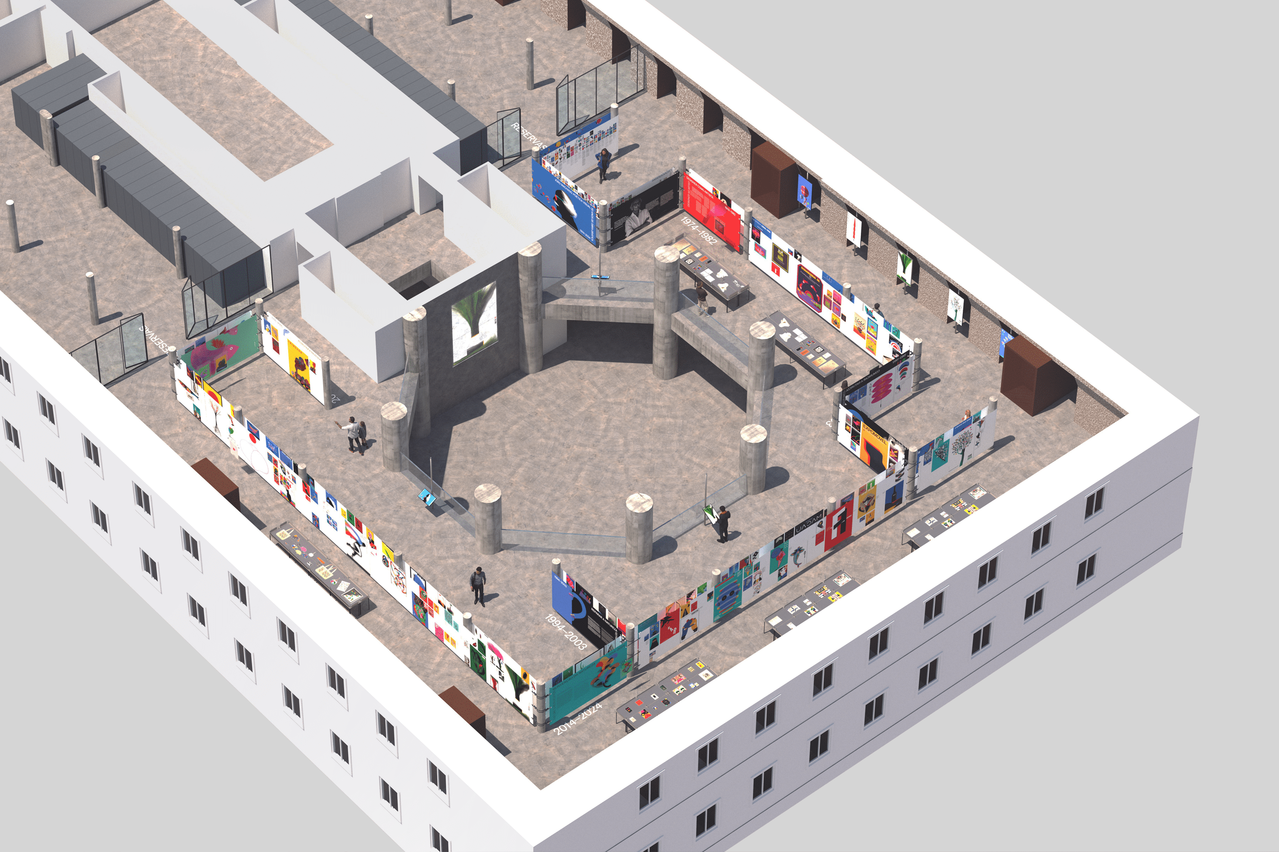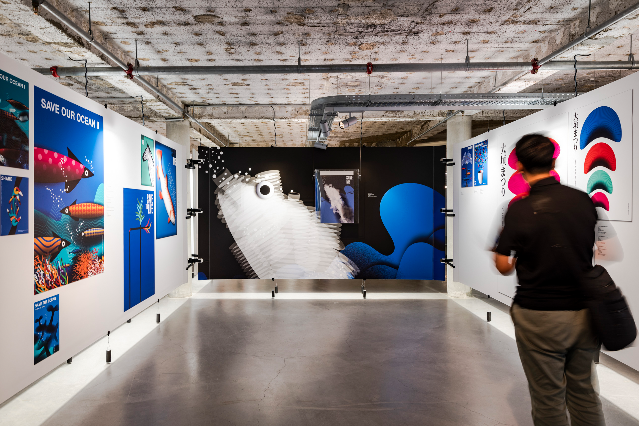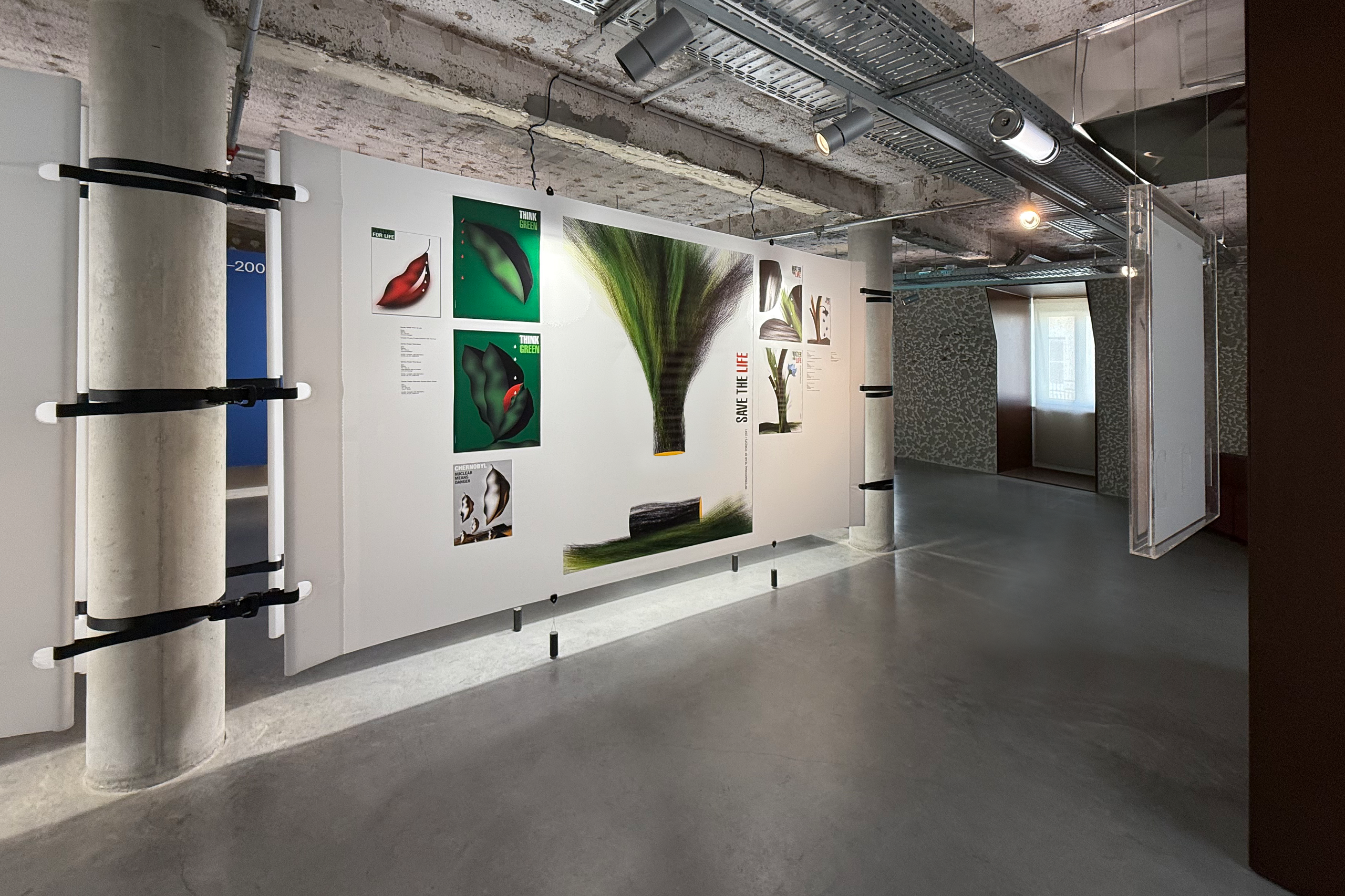 Within the double-height space, a large wall that dominates the entire area continuously projects a selection of posters, reinforcing the relationship between this exhibition and the MUDE collection.