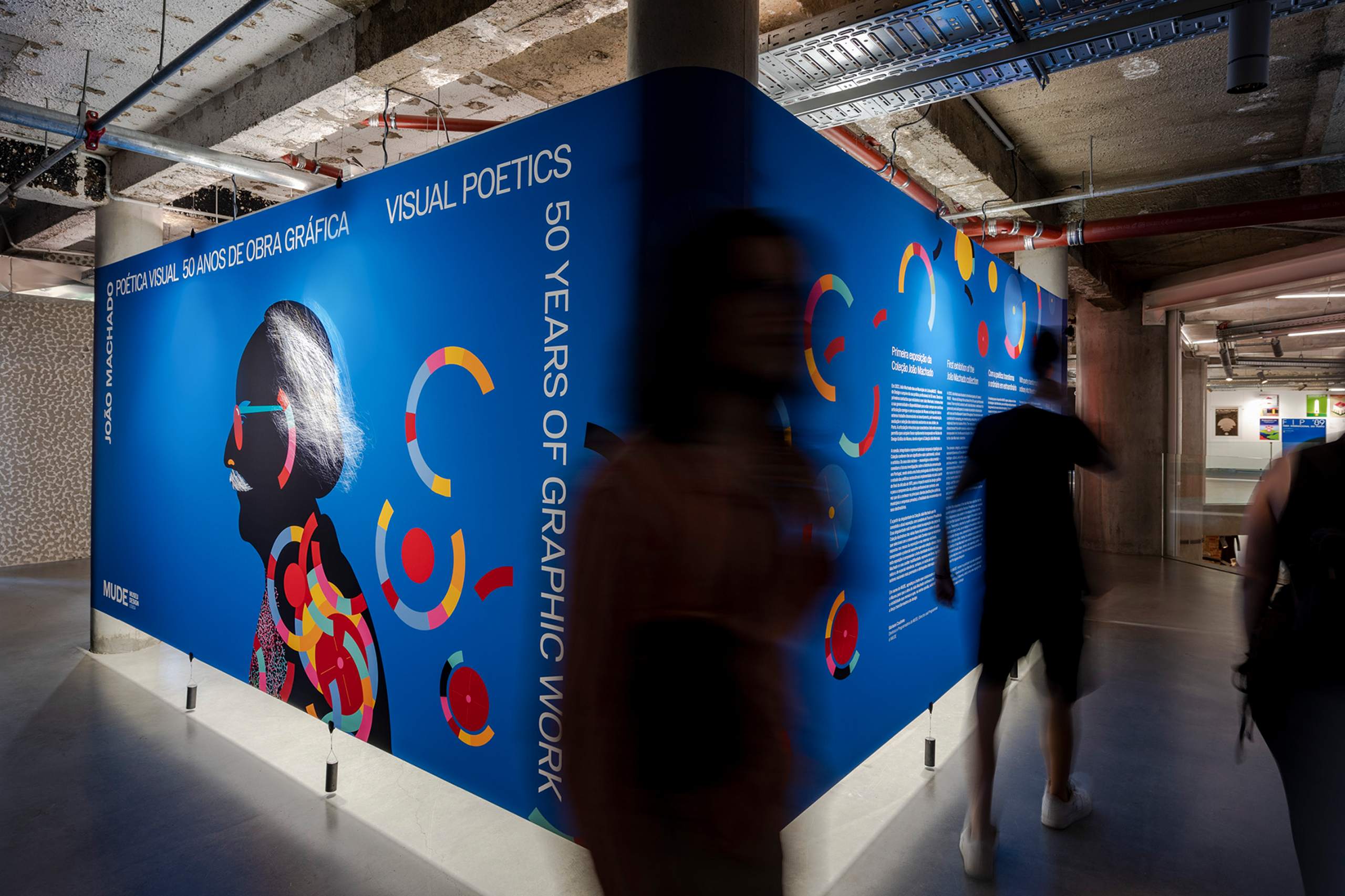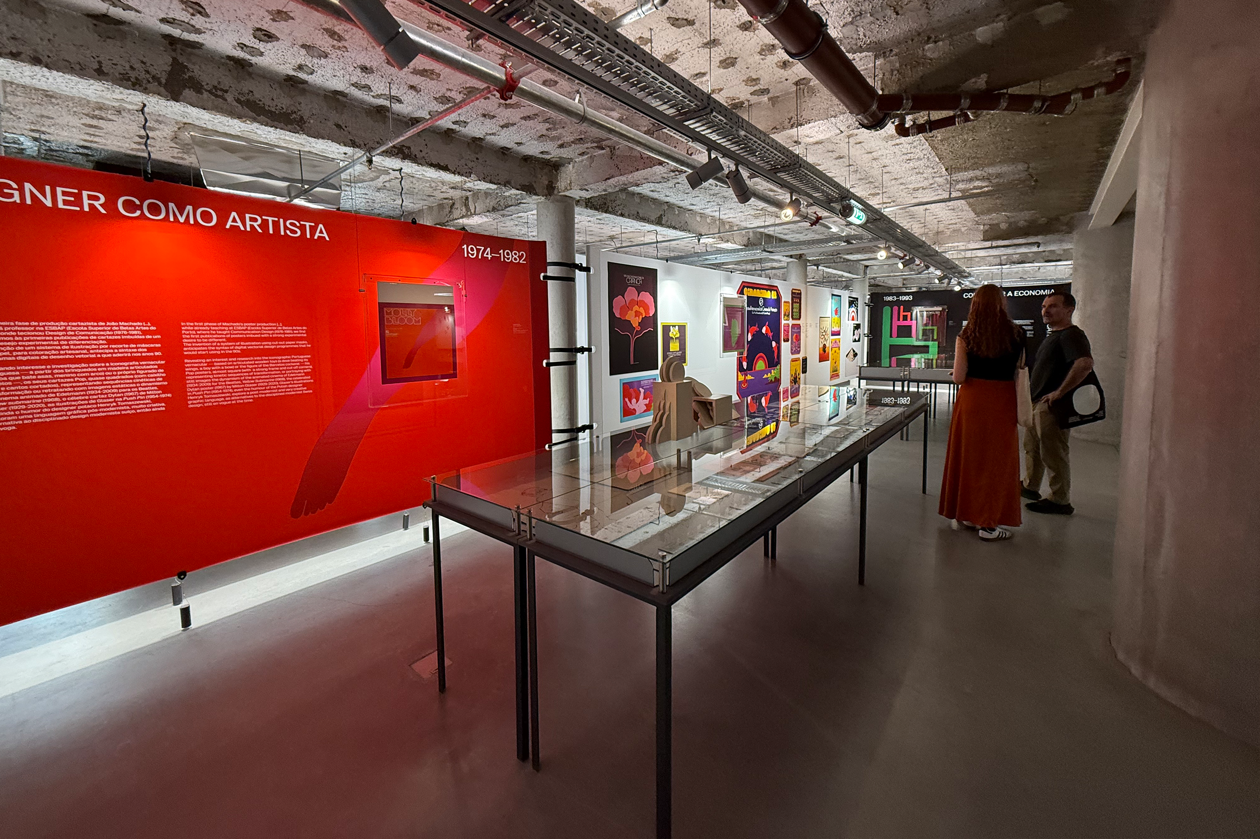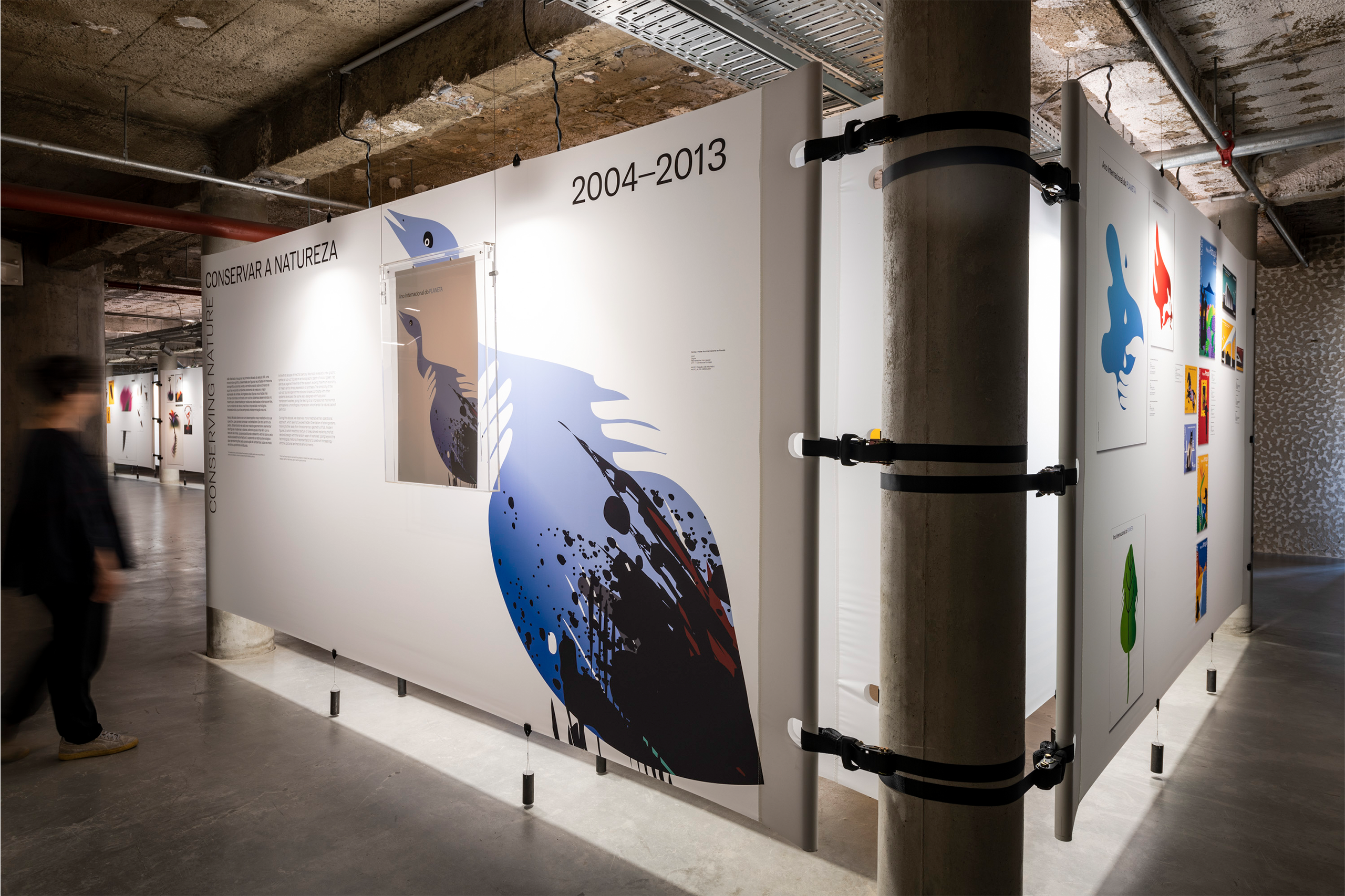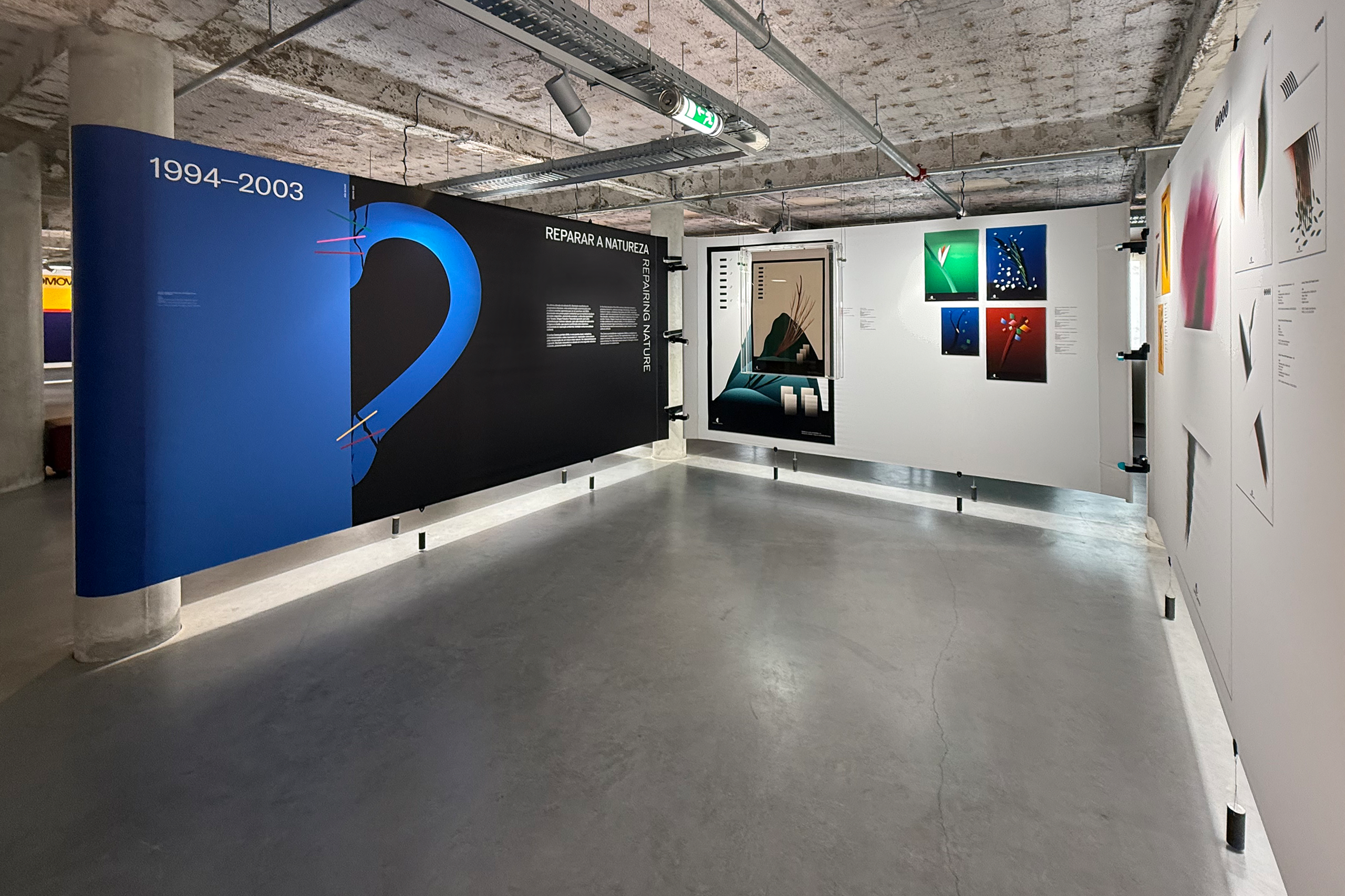 In dialogue with the building, the exhibition unfolds on a single level, organized around a vast double-height space that places it in direct dialogue with the MUDE permanent exhibition, located on the lower floor. A large continuous canvas surface extends horizontally, structured along the column system of the open-plan hall. This element configures new spaces and accommodates titles, curatorial and contextual texts, as well as a compilation of graphic works.