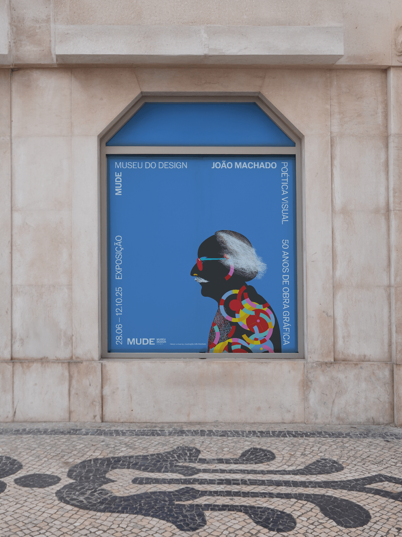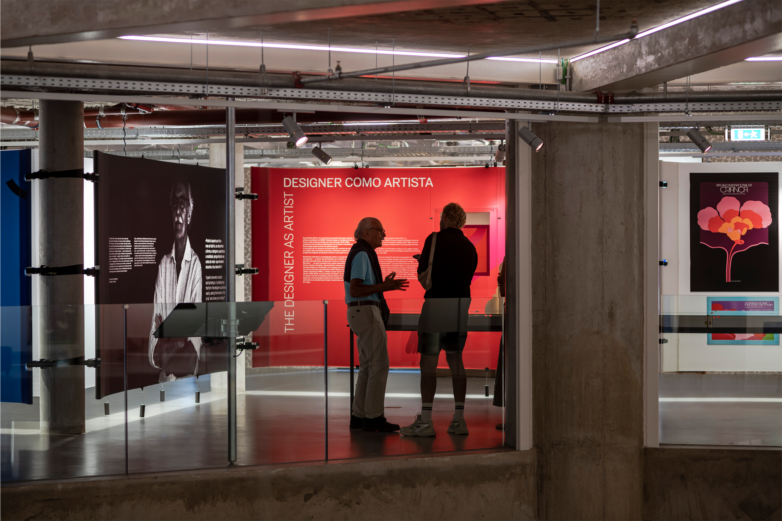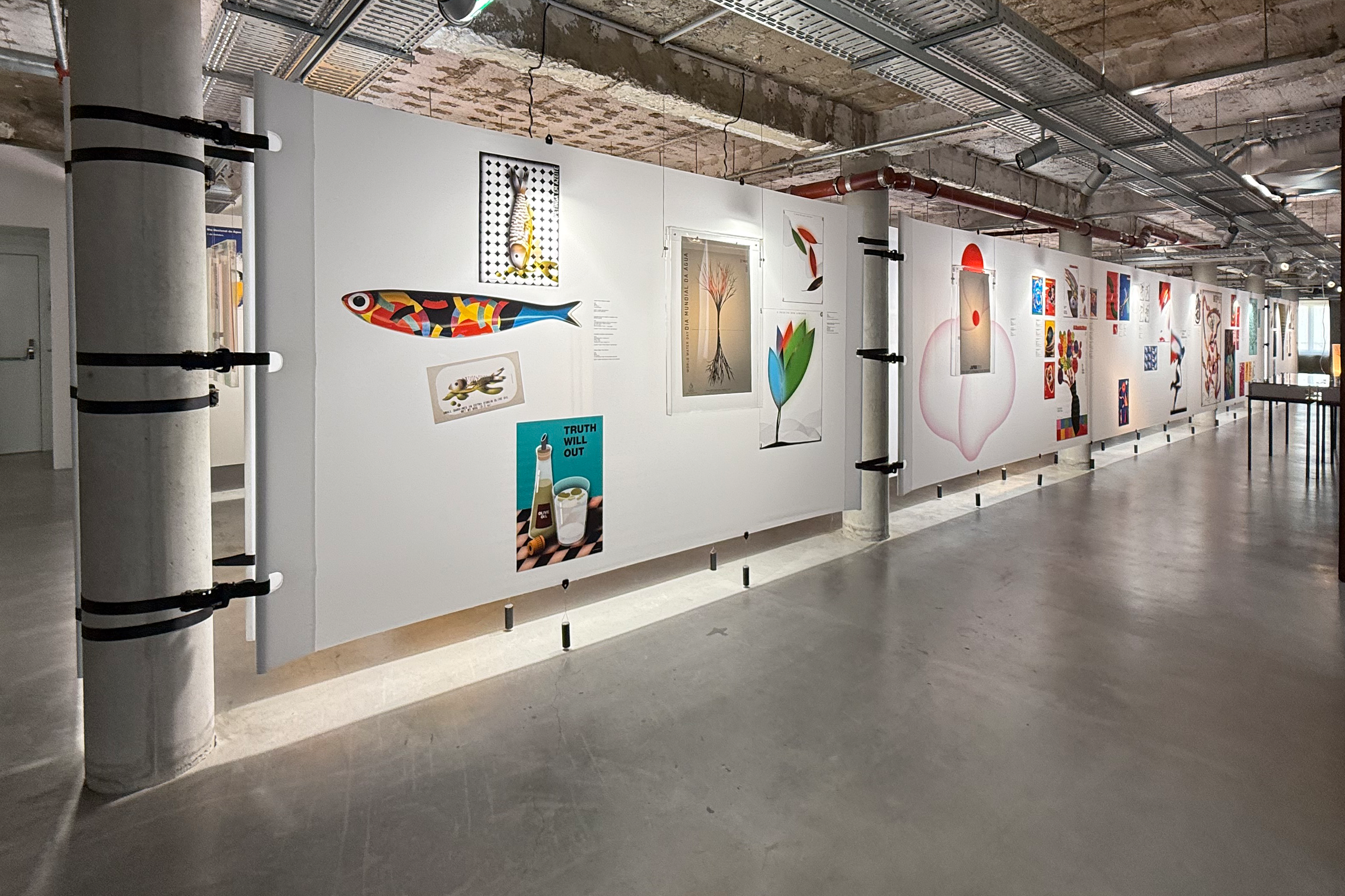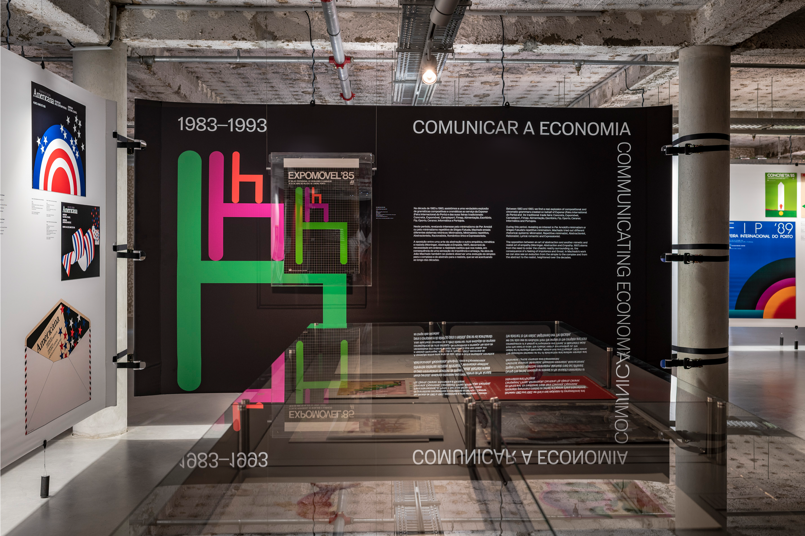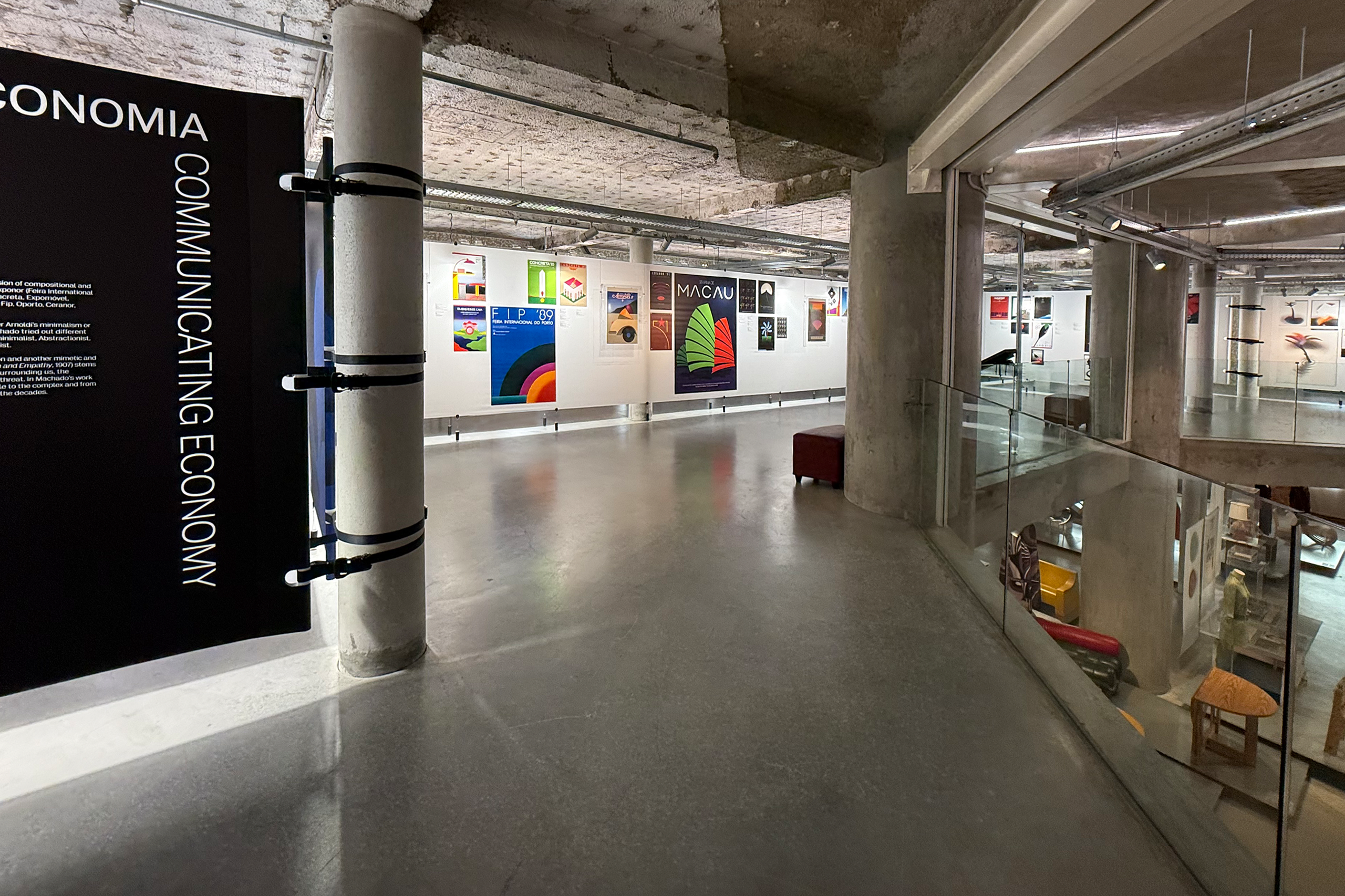 In dialogue with the building, the exhibition unfolds on a single level, organized around a vast double-height space that places it in direct dialogue with the MUDE permanent exhibition, located on the lower floor. A large continuous canvas surface extends horizontally, structured along the column system of the open-plan hall. This element configures new spaces and accommodates titles, curatorial and contextual texts, as well as a compilation of graphic works.