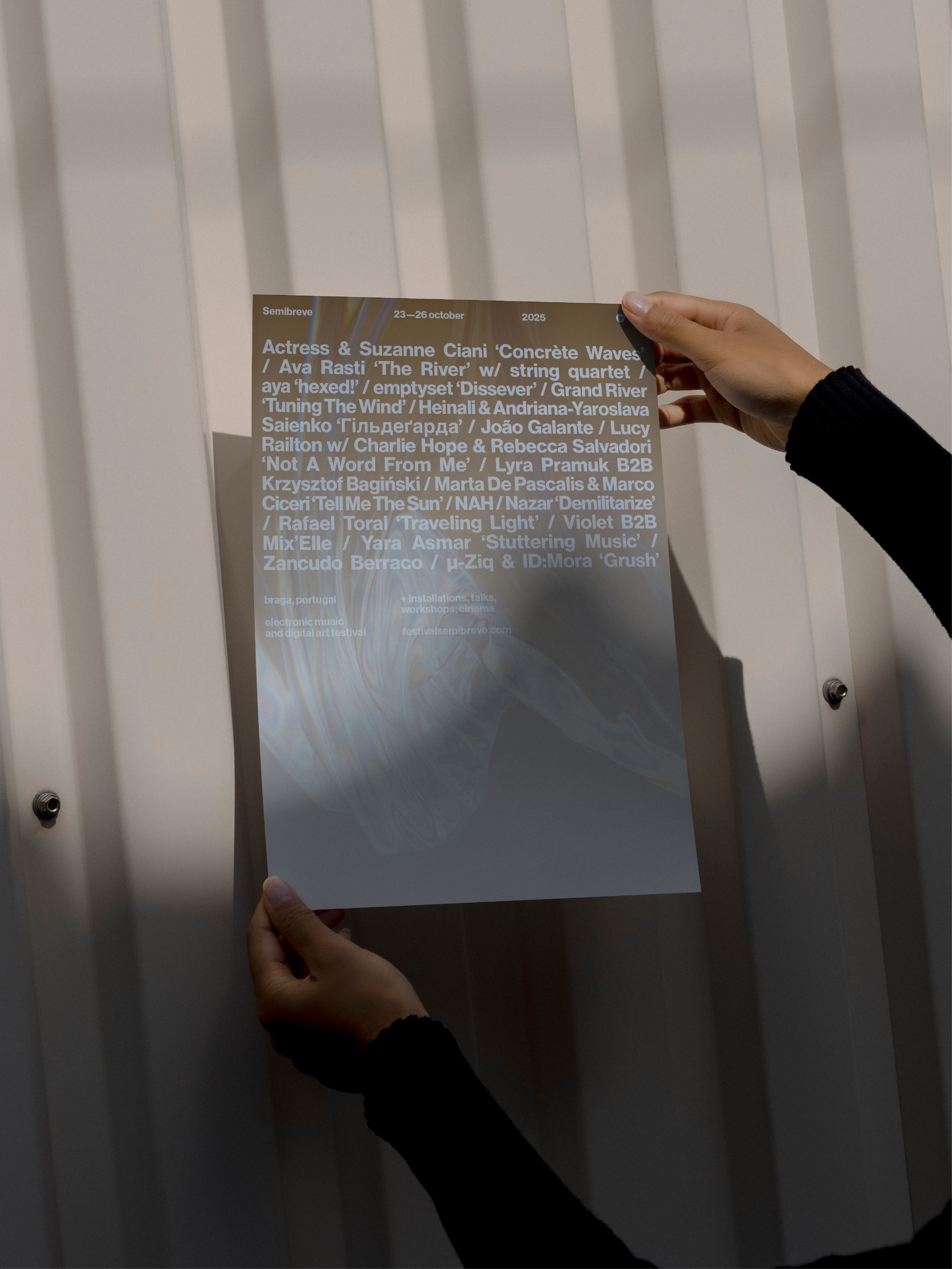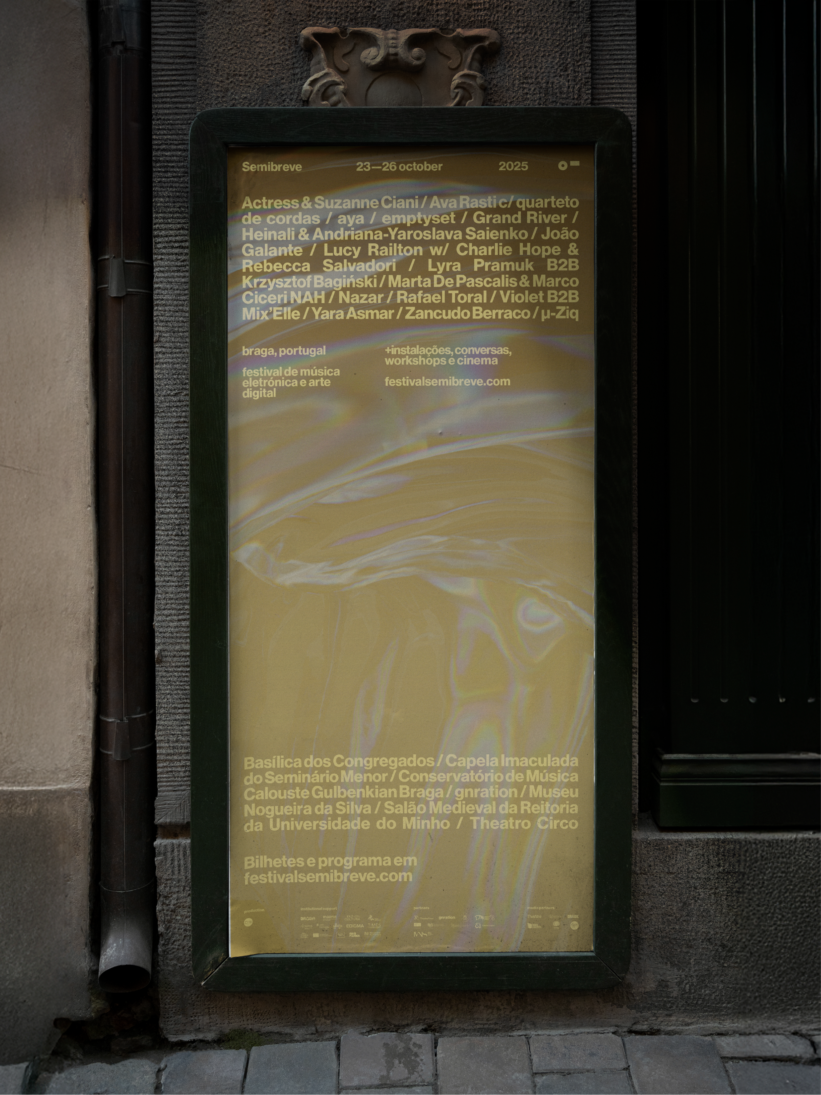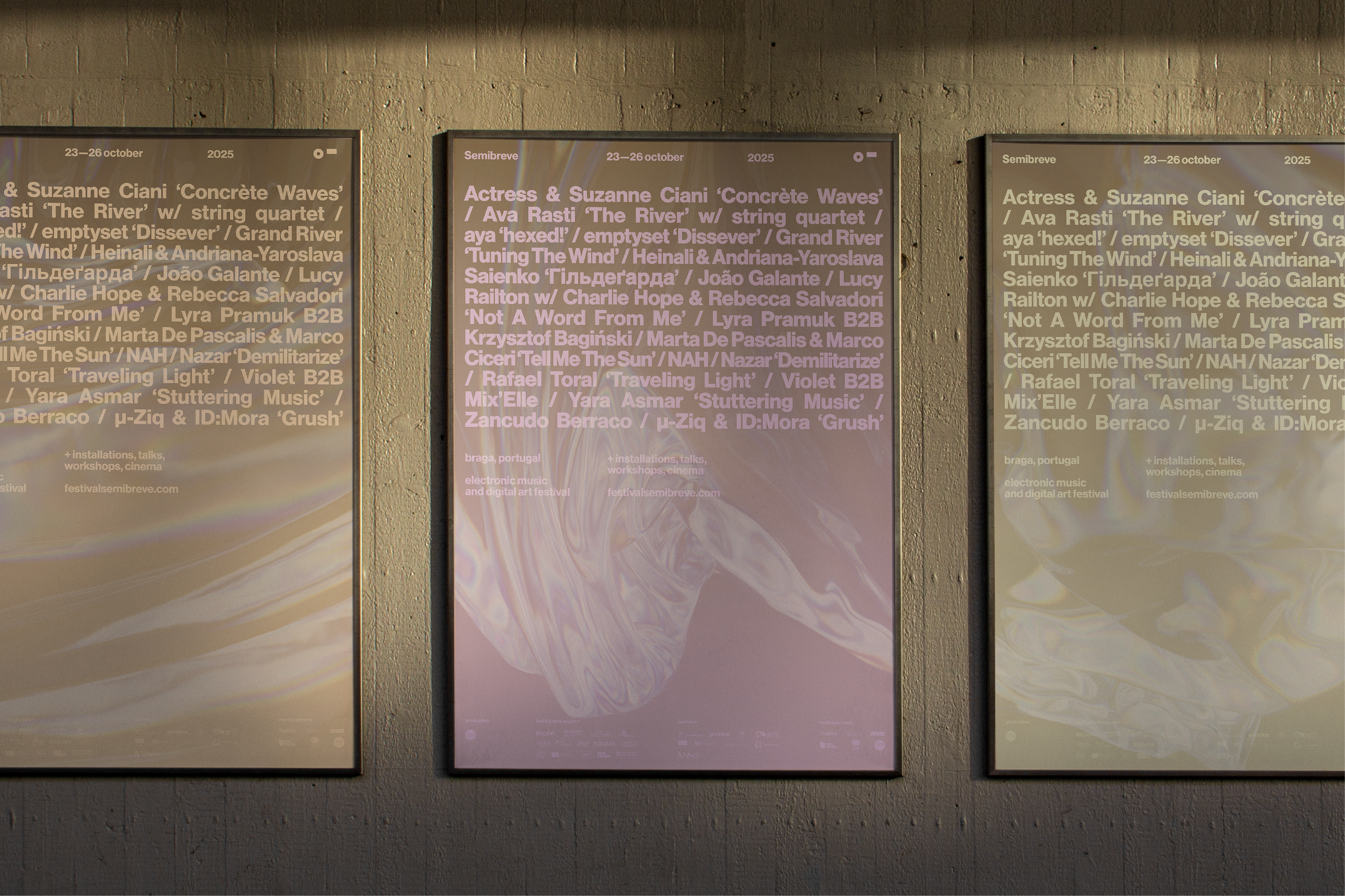 The graphic identity of the 2025 edition set out to visually reflect the relationship between sound, space, and perception. This year, information moved away from being a static element and adopted an experimental behaviour, responding to music and its rhythms. By allowing graphic elements to be affected by sound, communication became part of the festival’s artistic experience. The visual identity thus became another field of experimentation, in direct dialogue with Semibreve’s musical and conceptual programme.